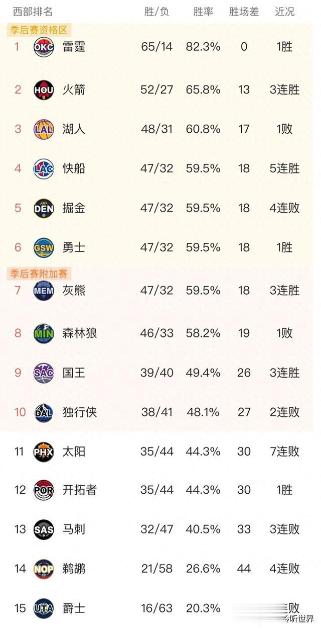 看看现在的西部,那叫一个乱,只有雷霆、火箭能确定排名,其他球队一个不小心就会掉入附加赛。而且快船、掘金、勇士、快船,灰熊战绩都是47胜32负,接下来的比赛都要攒足了劲努力奋斗,只有这样才能保住季后赛的希望。